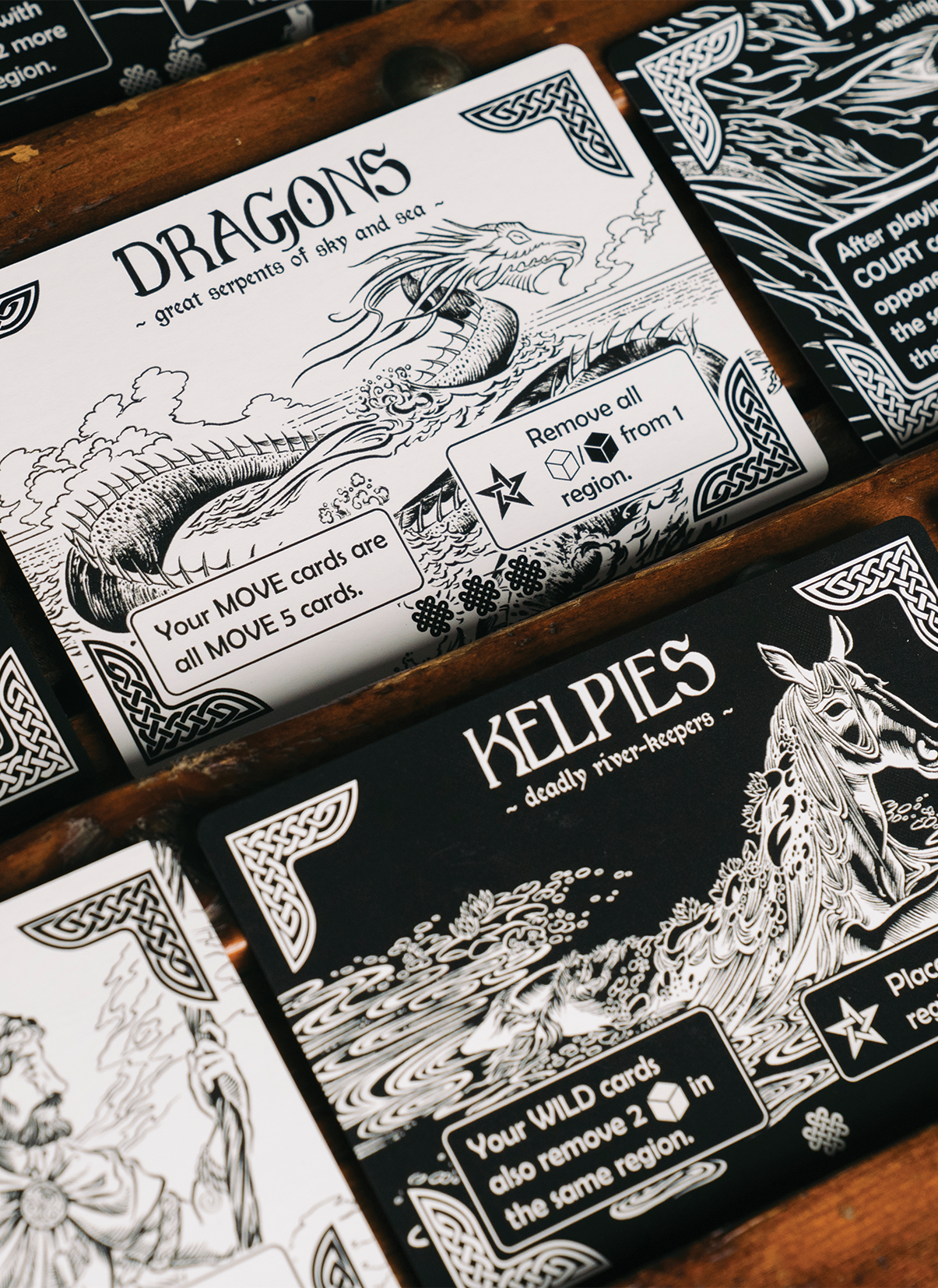 In Celtic legend, faefolk align themselves with courts of influence over the ancient lands. The Seelie are allies of spring and growth, while the Unseelie are those of cold and trickery. In Pacts, you shall rule one of these two courts, facing your eternal opponent in a duel of wits. Before starting, each of you will gain the assistance of mythological creatures such as dragons, banshees, and selkies to give you the edge. Each round, cards are dealt, where one player will split the possible actions between two piles, while the other will select who gets which set. You will each place, move, and remove influence across six regions and see who rules these sacred places, seeking majority control. The player who scores the best after three and six rounds will be declared the new ruler of this great isle.